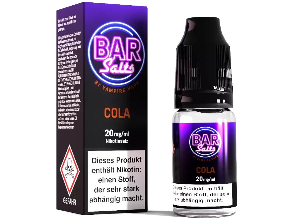 Mit dem Vampire Vape Cola Nikotinsalz Liquid aus der Bar Salts Reihe, erhalten Sie ein Liquid, welches beim Dampfen den Geschmack von Cola freisetzen wird. Beim NicSalt können Sie zwischen den Stärken 10 mg/ml und 20 mg/ml wählen. Das Liquid wird dabei, unabhängig von der Nikotinstärke, mit 10 ml Inhalt in einer 10 ml fassenden Flasche ausgeliefert. Anders als bei herkömmlichen Aromen, können Sie dieses Nikotinsalz Liquid direkt mit Ihrer E-Zigarette verwenden.